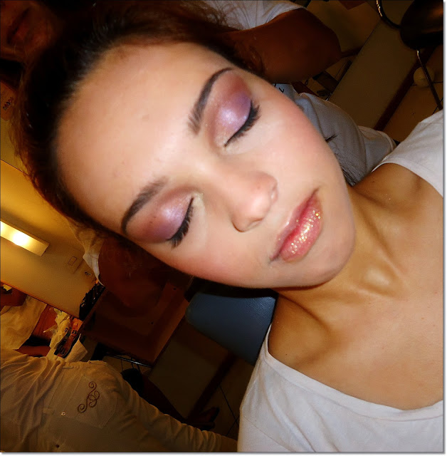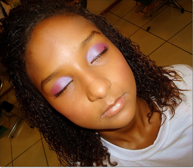 Essa lindeza de menina, havia me pedido uma make suave. Comecei com sombra perolada em toda pálpebra móvel e mesclei com um lilás que formou um efeito diferente. Sombra marrom no côncavo e esfumei com sombra iluminadora rosada. Blush rosinha, delineado simples e muitas camadas de rímel!!Gloss dourado nos lábios.