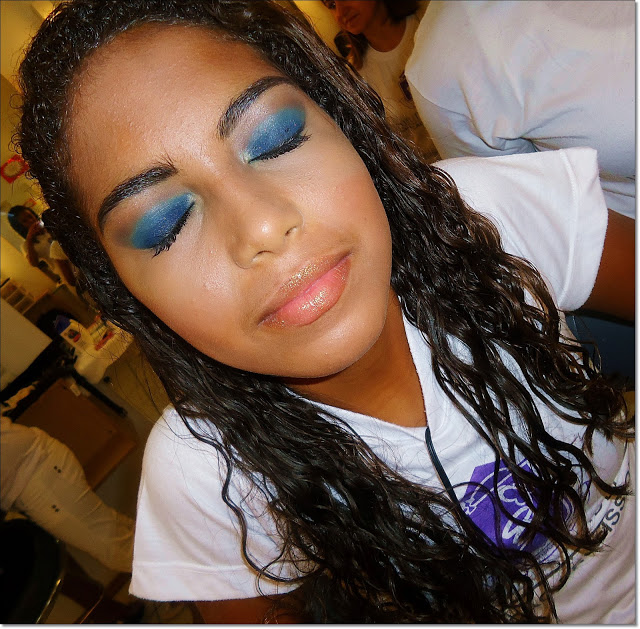 Por ser uma morena lindaaaa, investi num olhão azul, cheio de cores! Fiz de uma forma diferente; usei azul marinho em toda pálpebra e esfumei com sombra verde água, e fiz o côncavo com marrom, todas as sombras são opacas. Muuuuitas camadas de rímel e delineado. (que ficou quase imperceptível por conta do azul marinho). Blush bronze e gloss dourado.