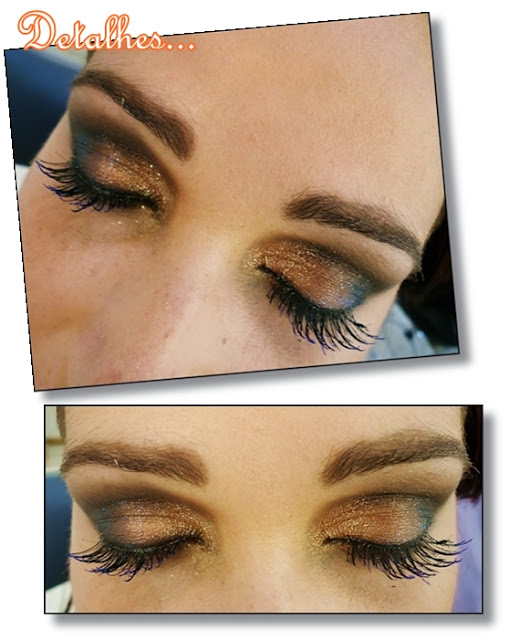 Nos cílios naturais apliquei rímel azul e nos postiços, preto. E na parte bronze da sombra, dei batididinhas com glitter azul caneta, bem de leve... O efeito ficou incrível! Pena que a câmera não foque toda a beleza real... :/