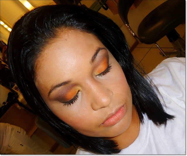 Misturei sombra amarela opaca com sombra perolada e coloquei no canto interno, mesclando com o laranjinha e o canto externo com sombra preta com glitter. Fiz o côncavo com sombra marrom mais cintilante, delineado simples e muito rímel!! Blush rosado e o gloss dourado! (que eu esqueci de passar antes da foto.) :/