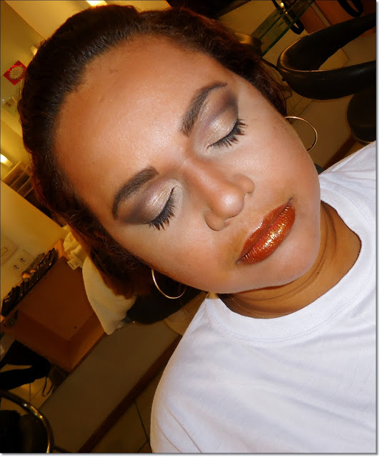 Marquei o côncavo com sombra opaca marrom e esfumei bastante; muita máscara para cílios e blush bronze. Nos lábios, usei um lápis de boca cor ''carne'' (é estranho, eu sei) e por cima o gloss dourado que elas tanto amaaamhahaha. Pra mim, foi uma make simples e muito bonita. Ela ficou muito satisfeita e recomendou o uso em eventos de dia, como casamentos. Sabida, não?! rs