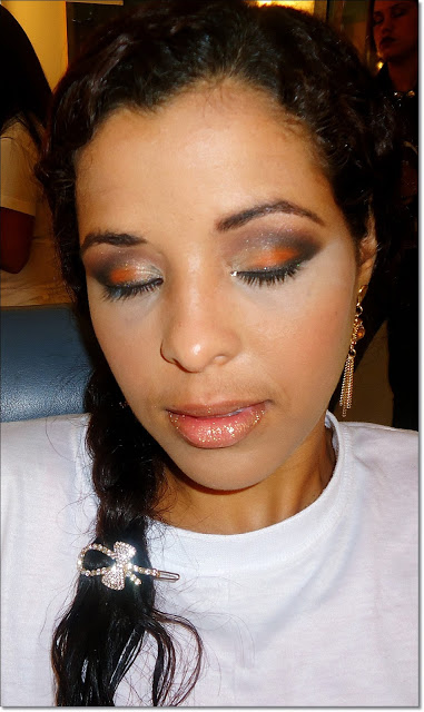 Essa foi a minha 1ª modelo. LINDA Sabrina! Mas o que me deu mais trabalho foi corrigir as olheiras dela, que são bem profundas. Nos olhos usei um tom de bronze e por cima misturei um tom de pérola rosado. Marquei com uma sombra marrom opaca o côncavo e esfumei bastante; iluminei rente a sobrancelha com a mesma sombra pérola e mesclei com o esfumado do côncavo. E no cantinho interno usei uma sombra propria iluminadora com reflexos em dourado. (Sombra 25 da Catharine Hill.)
