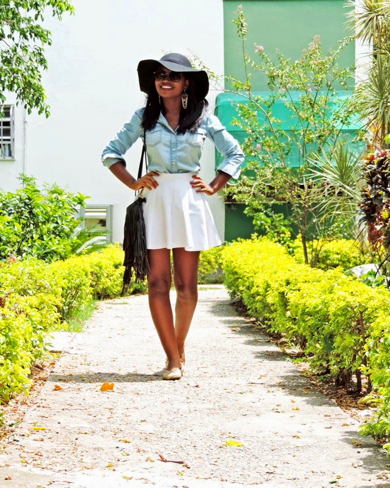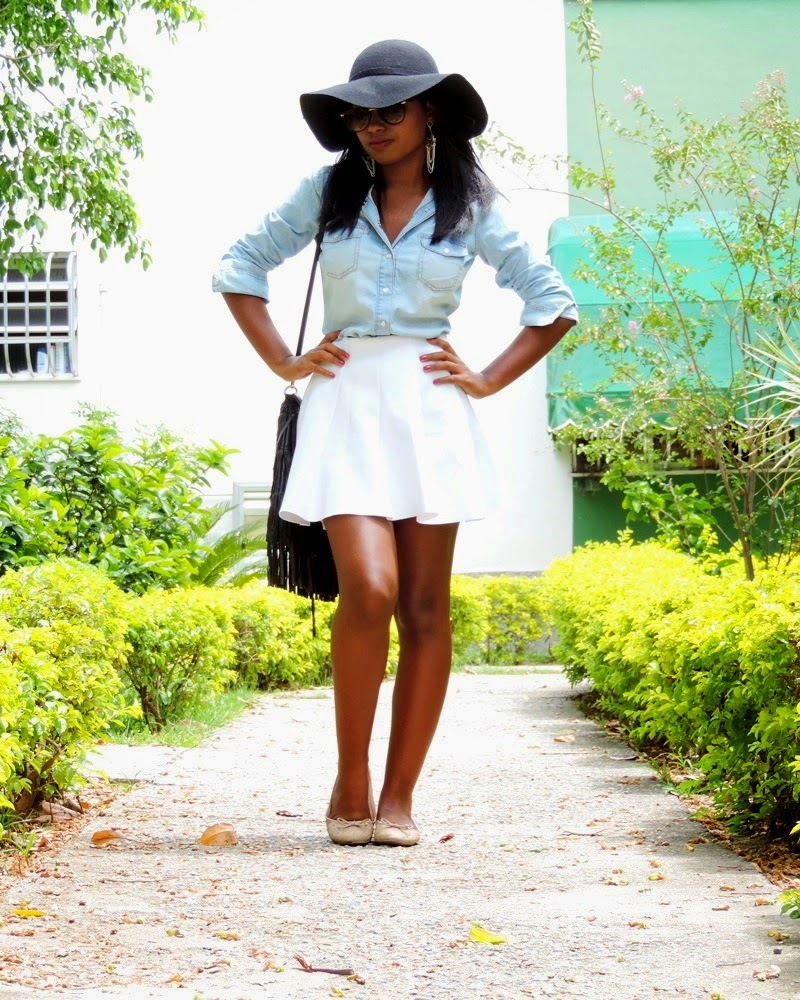 Para compor o look de hoje eu contei com ajuda da consultora de moda Thaina Vargas que além de ser uma ótima profissional é minha amiga. Haha’ a Thaina com o seu conhecimento e estudo me deu altas dicas para compor um look bacana que se adaptasse ao meu corpo e estilo de vida. Para compor o look as peças escolhidas foram: Blusa Jeans, Saia Rodada, Sapatilha, Bolsa de Franja e para dar um toque nesse visual o famoso chapéu Floppy que veio com tudo no finalzinho do ano de 2014 e ainda vai fazer muito sucesso no mundo da moda.