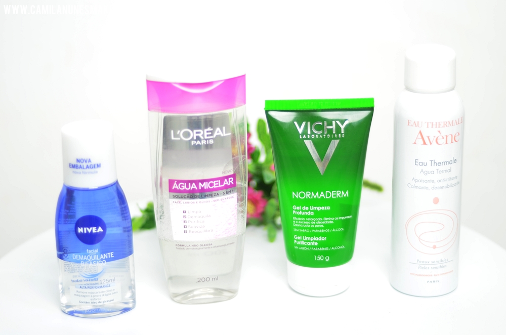 O meu primeiro passo na rotina de cuidados é remover a maquiagem, eu uso para remover a maquiagem das área dos olhos o demaquilante bifásico da Nivea ele remover toda a make, até aquelas mais difíceis, eu super recomendo. Ele custa em média R$ 25,00. Você encontra em farmácias e drogaria.